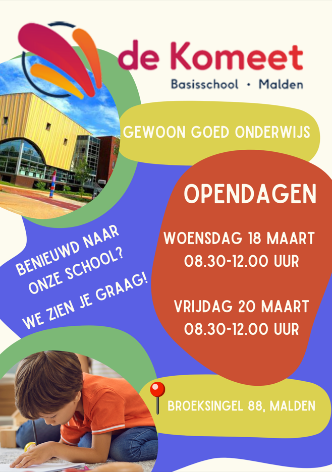 De Komeet is een basisschool in Malden waar kinderen met plezier leren in een veilige, gestructureerde omgeving. We bieden uitdagend en degelijk onderwijs in jaarklassen met oog voor rust, overzicht en betrokkenheid. Als katholieke school vieren we de christelijke feestdagen. We staan ook open voor andere levensbeschouwingen. Zo creëren we een inclusieve plek waar ieder kind én iedere ouder zich welkom voelt.